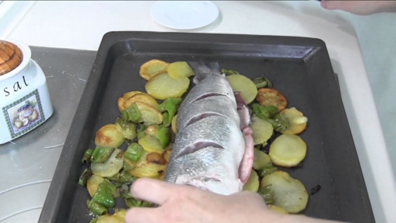 LUBINA AL HORNO RELLENA Ingredientes 1 lubina grande (sobre 800 gramos) 2 ó 3 patatas 2 pimientos verdes 1 limón Unos filetes de jamón serrano Sal y aceite d...