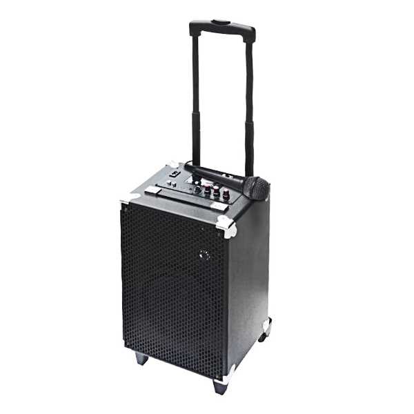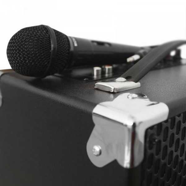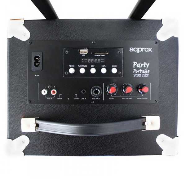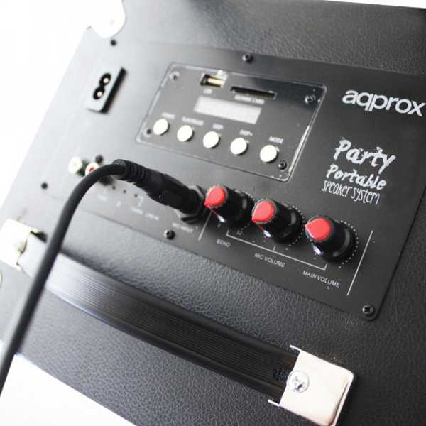 | Otras características | - Altavoz Bluetooth 2.0 + EDR - Voltaje de entrada: 5 VDC - Batería Recargable: 12V/2.6Ah - Duración: 3-6 horas - Tiempo de carga: entre 3 y 6 horas - Slot SD para reproducir la música directamente - Entrada Auxiliar Jack 3.5mm - Entrada Auxiliar RCA - Potencia de salida: 30W - Frecuencia: 100 Hz-18 KHz Características - Colores: Negro - Peso: 6.9 Kg. aprox. - Material: Madera, Aluminio y ABS Embalaje - Speaker APPrave - Guía rápida de instalación - Micrófono con cable - Cable de alimentación AC - Cable Aux jack 3.5mm |