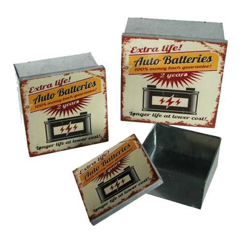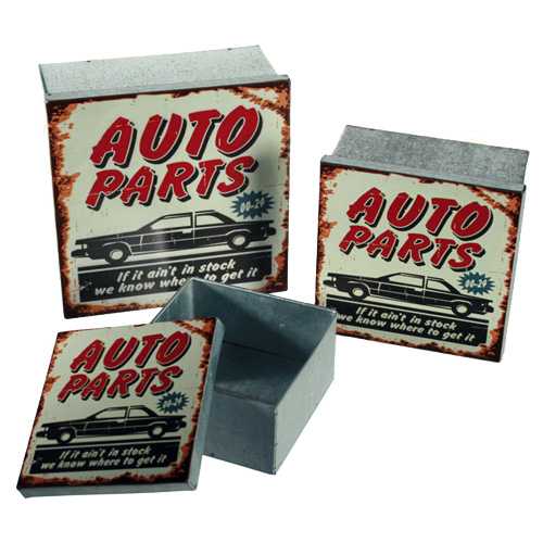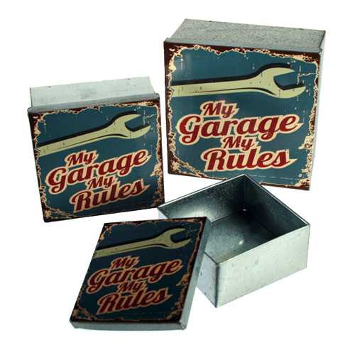 ¡Consigue ya las originales cajas metálicas Vintage Coconut (3 piezas), perfectas como decoración y muy prácticas para guardar tus cosas! Diseño inspirado en el mundo del coche y la mecánica. Se incluyen 3 cajas de metal de varios tamaños (unas se guardan dentro de las otras, como las típicas muñecas rusas). Dimensiones aprox.: 15 x 7 x 15 cm, 12 x 6 x 12 cm y 10 x 5 x 10 cm. Ideales para hacer un regalo original.