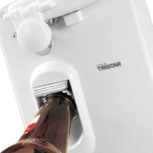 El abrelatas Tristar BO-2102 es un accesorio de cocina 3 en 1: abrelatas eléctrico, afilador de cuchillos y tijeras, y abrebotellas.