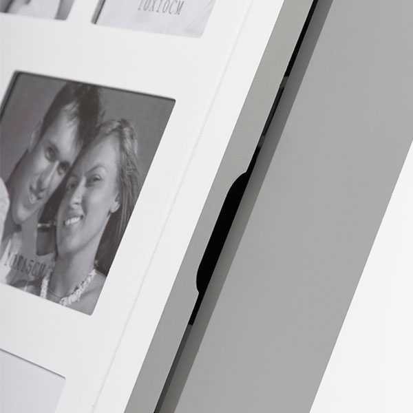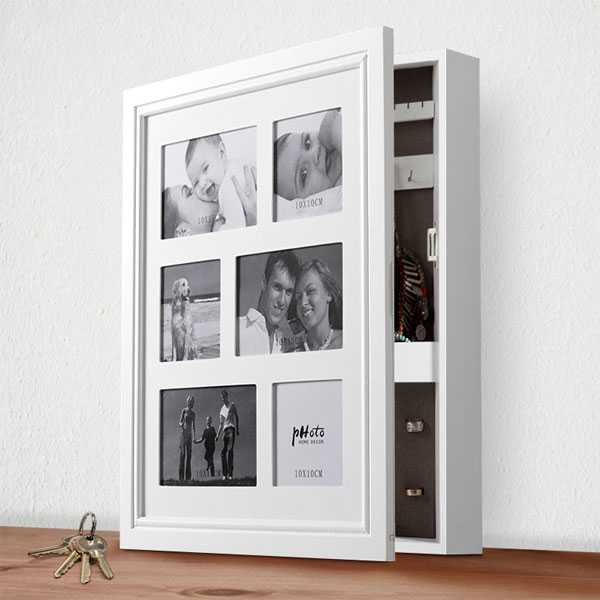 ¡El armario joyero de madera con portafotos múltiple Homania quedará perfecto en tu habitación! Este joyero de sobremesa práctico, moderno y elegante dispone de espacio para 6 fotos: 3 de 10 x 15 cm y 3 de 10 x 10 cm. Puerta con cierre magnético. Detalle del interior: 1 barra para colgar pulseras, 11 ganchos para colgar collares, 20 muescas para pendientes y 30 ranuras para anillos. Medidas aprox.: 36 x 44 x 7 cm.