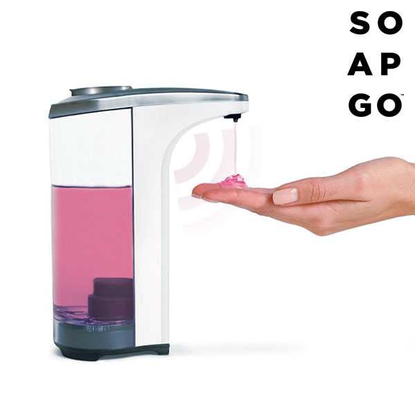 Descripción A partir de ahora será mucho más práctico y cómodo que toda la familia se lave las manos con el dispensador de jabón automático Soap Go S500. Su sensor de proximidad sabrá cuándo se debe expulsar el jabón y se parará de manera automática. Funciona con pilas (4 x AA, no incluidas). Dispone de indicador LED, base antideslizante y botón para seleccionar más o menos jabón. Capacidad aprox.: 500 ml.  Medidas aprox.: 7 x 19 x 15 cm.