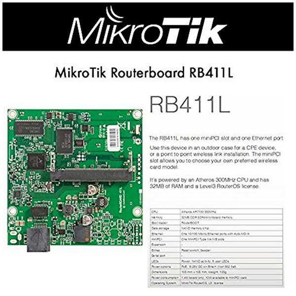 Una routerBOARD pequeña con un precio mínimo. Su tamaño la hace muy apropiada para ser integrada en equipos CPE o como enlaces punto a punto de backup, gracias a su Slot miniPCI donde se puede acoplar cualquier radio inalámbrico. La RB411L va con licencia RouterOs L3.