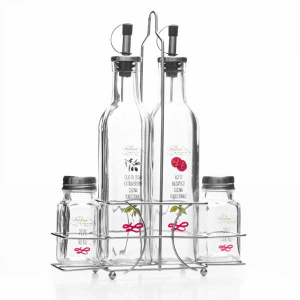 - Incluye soporte, aceitera, vinagrera, salero y pimentero