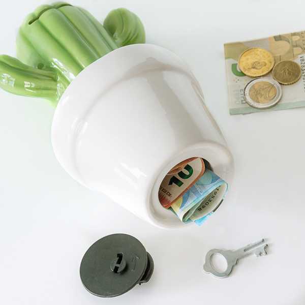 ¡La hucha de cerámica Cactus Wagon Trend es el sitio perfecto para guardar tu dinero!www.wagontrend.comRanura en la parte superior para introducir el dineroTapón de plástico en la base y llave...