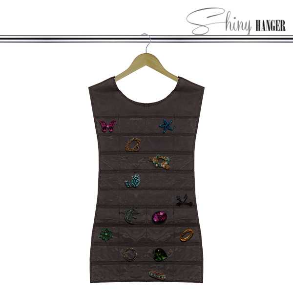 ¡Cuelga ya en tu armario el vestido organizador de joyas Shiny Hanger Black! Este original joyero tiene forma de vestido y resulta muy práctico y cómodo para organizar las joyas y complementos. Simplemente tienes que colgarlo en el armario como cualquier otro vestido. Por un lado dispone de 36 bolsillos de plástico transparente (9 filas con 4 bolsillos cada una), y por el otro lado cuenta con 18 cierres de velcro (3 filas con 6 velcros cada una). Medidas aprox.: 45 x 82 cm. Color: negro.